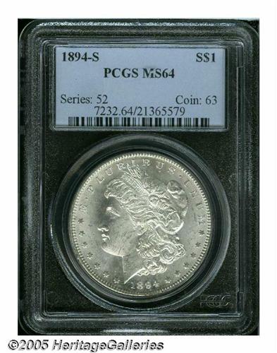 <B>1894-S<S$1> MS64 PCGS.</B></I> Each side of this 1894-S dollar displays bright, fully lustrous surfaces that are essentially untoned. The design elements are adequately struck, except for softness on the hair over liberty's ear. Light contact marks located on Liberty's cheek and neck limit the grade. Roller marks (as made) are seen over each side, but are more prominent on the reverse.