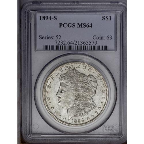 <B>1894-S<img border='0' src='http://www.heritagecoins.com/images/star.gif' width=10 height=10>$1> MS64 PCGS.</B></I> Each side of this 1894-S dollar displays bright, fully lustrous surfaces that are essentially untoned. The design elements are adequately struck, except for softness on the hair over Liberty's ear. Light contact marks located on Liberty's cheek and neck limit the grade. Roller marks are seen over each side, but are more prominent on the reverse.
