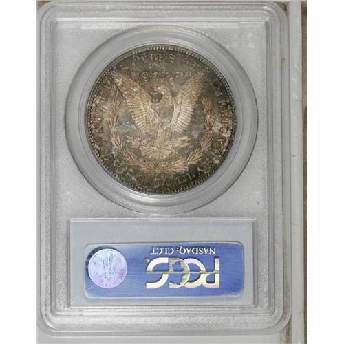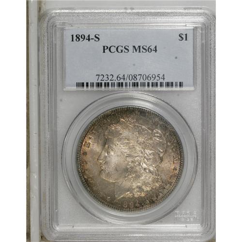 <B>1894-S S$1 MS64 PCGS.</B></I> Each side of this near-Gem is draped in a lovely blend of gold, amber, russet-red and cobalt-blue patina. The strike shows typical San Francisco weakness at the centers, but uniform boldness elsewhere. The unusually intense luster produces dazzling cartwheel splendor in the fields.<BR><BR><b>Shipping:</b> Coins & Currency (<a target="_blank" href="http://www.heritageauctions.com/common/shipping.php">view shipping information</a>)