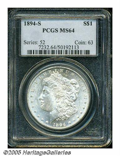 <B>1894-S<S$1> MS64 PCGS.</B></I> The essentially brilliant surfaces are rendered even brighter by the presence of heavy die striations (as struck) in the fields, on the reverse. The obverse is simply bright and satiny. Boldly struck, with typical slight weakness evident directly above Liberty's ear, with a few abrasions scattered over each side.