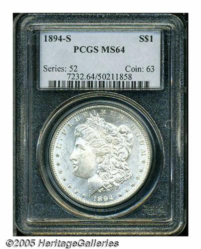 <B>1894-S<S$1> MS64 PCGS.</B></I> This is a wonderful example with fully brilliant silver surfaces that are void of toning. The luster is satiny and imparts a slightly prooflike appearance. A scarce issue that is hard to find in Choice condition.