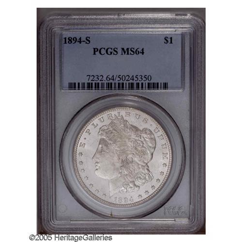 <B>1894-S<S$1> MS64 PCGS.</B></I> This near Gem S-Mint is virtually untoned on the obverse, while the reverse shows a thin veneer of faint champagne, ice-blue, and rose coloration. The design features are well impressed, though the hair over Liberty's ear is a trifle soft. A few minute marks on Liberty's cheek and in the fields of both sides limits the grade.