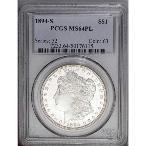 <B>1894-S<img border='0' src='http://www.heritagecoins.com/images/star.gif' width=10 height=10>$1 MS64 Prooflike PCGS.</B></I> Snow-white with nice reflectivity and some cameo contrast. The strike is nice, but the surfaces display a few too many marks for Gem consideration.