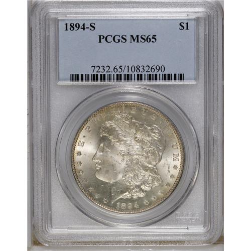 <B>1894-S S$1 MS65 PCGS.</B></I> Light gold color overlays the strong satin luster visible on the surfaces of this Gem. Well, if not quite fully struck, with surfaces blessed with a minimum of distracting abrasions, as appropriate for the grade. Difficult to find finer than this piece.<BR><BR><b>Shipping:</b> Coin/Currency (<a target="_blank" href="http://www.heritageauctions.com/common/shipping.php">view shipping information</a>)