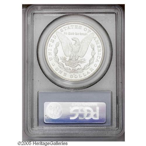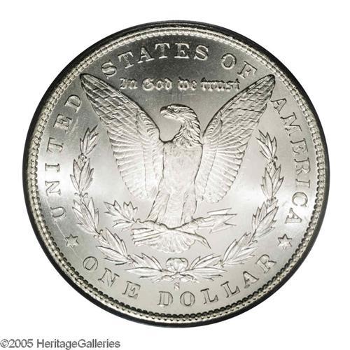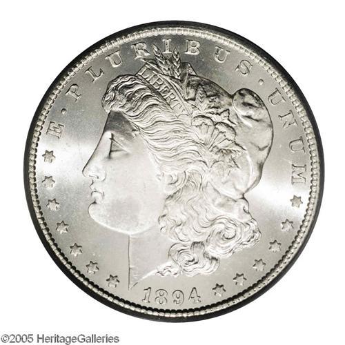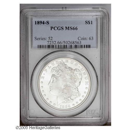 <B>1894-S<S$1> MS66 PCGS.</B></I> Struck during a brief 3-year span when Morgan dollar production was dramatically scaled back, the 1894-S is the most easily obtainable issue struck this year at the Uncirculated level. While luster is never a problem with the 1894-S Morgan, the vast majority of Mint State survivors, however, are limited in grade by moderate to heavy abrasions and are occasionally hampered by the presence of roller marks across the central devices.<BR> Over the past five years we have offered several of the finest 1894-S dollars ever certified, the nicest of which was a peripherally toned representative sold just a couple of months ago, a piece that brought an impressive $34,500. Just when we thought it might be many years before we saw its equal, along comes a remarkable untoned example that clearly proves that kind of thinking wrong. Everything seems to come together on this scintillating Premium Gem. The strike is temptingly close to full, the cartwheel luster jumps from the peerless surfaces, and the silky-smooth, frosty devices would be noteworthy even on a less challenging S-mint issue. In short, a coin with record setting potential. Population: 9 in 66, 2 finer (11/05).