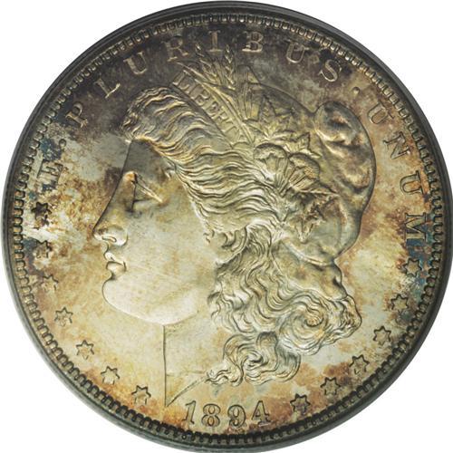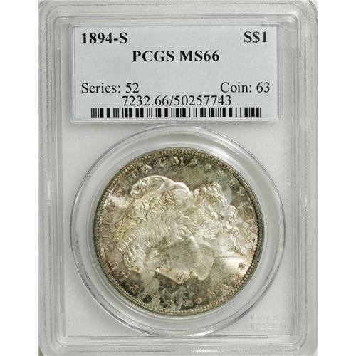 <B>1894-S S$1 MS66 PCGS.</B></I> VAM-1A. The obverse has a few die polishing lines including a heavy die scratch along the front edge of Liberty's eye. The 1894-S is infrequently encountered in the better Mint State grades. The Premium Gem specimen offered in this lot displays dazzling luster overrun with occasional splashes of lavender, cobalt-blue, and golden-brown coloration. The design elements show excellent definition, though slight softness is noted in the hair over Liberty's ear. A few minor scuffs on Liberty's cheek and neck are all that preclude an even higher grade.<BR> Auction appearances for coins in this ultimate grade vary widely over the last few years from a low of $6,325 in February 2005 to $34,500 in November of the same year. Only three other coins have appeared in public auction (all Heritage sales) in 2006 and 2007, and further confirm the wide swing in prices for high grade '94-S dollars. The prices for the other three coins were $7,475, $12,500, and $16,100. The listing of these recent auction prices underscores how perception plays a pivotal role in the ultimate price realized for this issue in this grade. It will be interesting to see how bidders perceive (and thus value) this piece and the other MS66 coin that is the main part of the catalog. Population: 9 in 66, 2 finer (2/07).<BR><I>From The Jackson Hole Collection.</B></I><BR><BR><b>Shipping:</b> Coins & Currency (<a target="_blank" href="http://www.heritageauctions.com/common/shipping.php">view shipping information</a>)