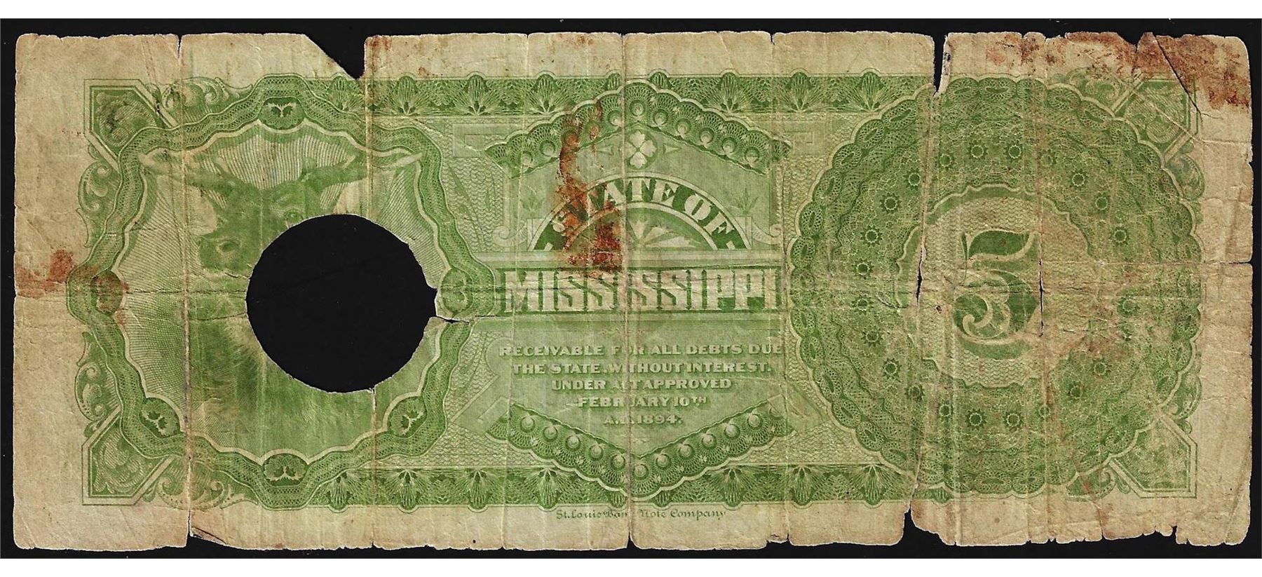 One 1894 State of Mississippi 5 Dollar Special Warrant Note.