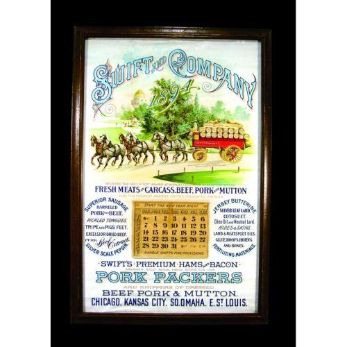 1894 Swift and Company Calendar, full pad. Stunning color and graphics. Great subject matter. A few wrinkles at the top otherwise excellent original condition. Framed under glass, 17 1/2 X 27 1/2 inches.