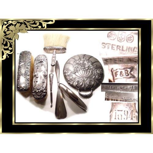 Can you imagine this on an antique vanity? Solid sterling pieces that are so richly decorated that you can only be very impressed with the craftsmanship that went into these gorgeous pieces! There are TWO large brushes, a wisk brush, nail implement and shoe horn, nail buffer and I am also including the oddest round hand mirror I have seen. It almost looks like it should open up like a compact ( but this one is HUGE) because you can see little knob like things on the sides. I can?t figure out and if it opens so I will leave that to the new owner. I have more photos of this if you want to email me. ALL the pieces are marked sterling except that mirror . I made a close up in the photo with all the pieces of the hallmarks and as you can see one is dated 1894 and others are marked Birk sterling , W sterling, F& B sterling and one that is marked with the Lion, an anchor and another mark I can?t make out. The largest piece is 9? long and the mirror and two brushes are 7? each. The lot of these are very elaborate and in very good condition less the mirror which has scratches.