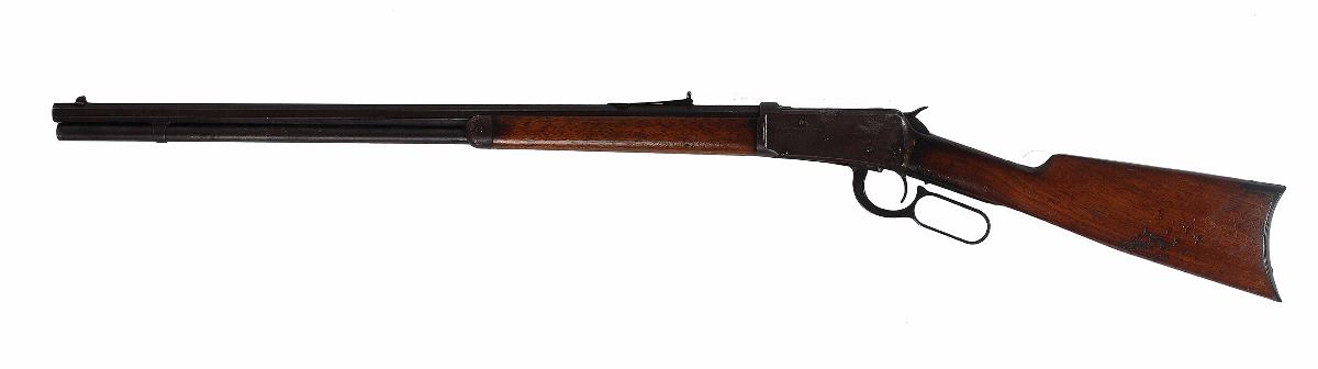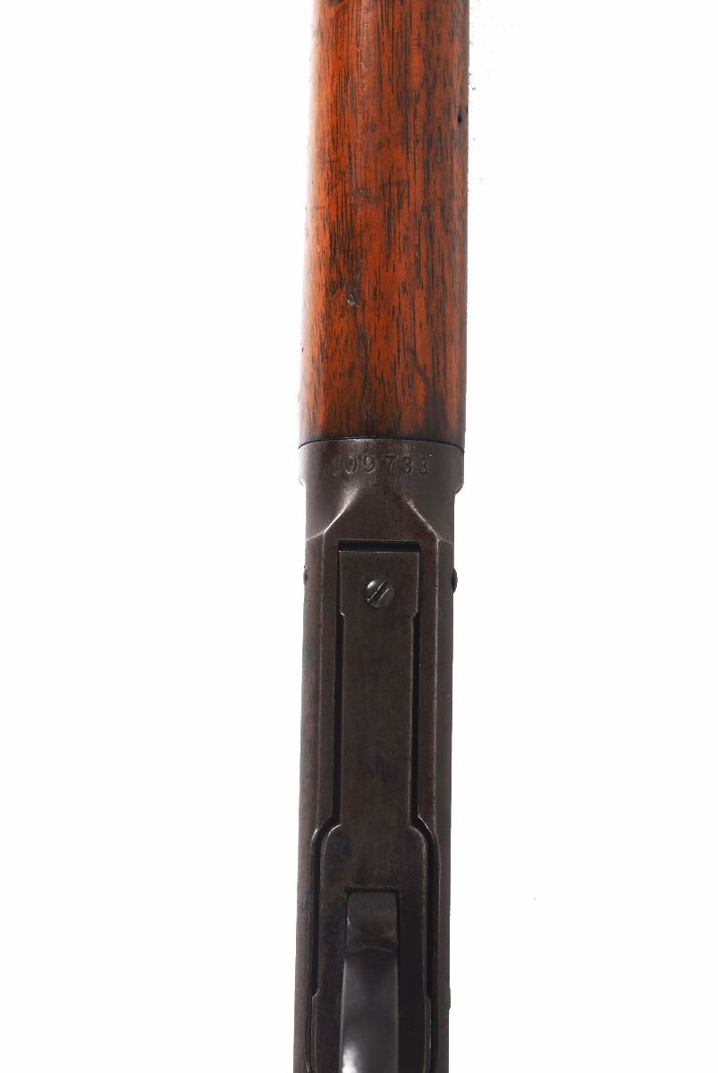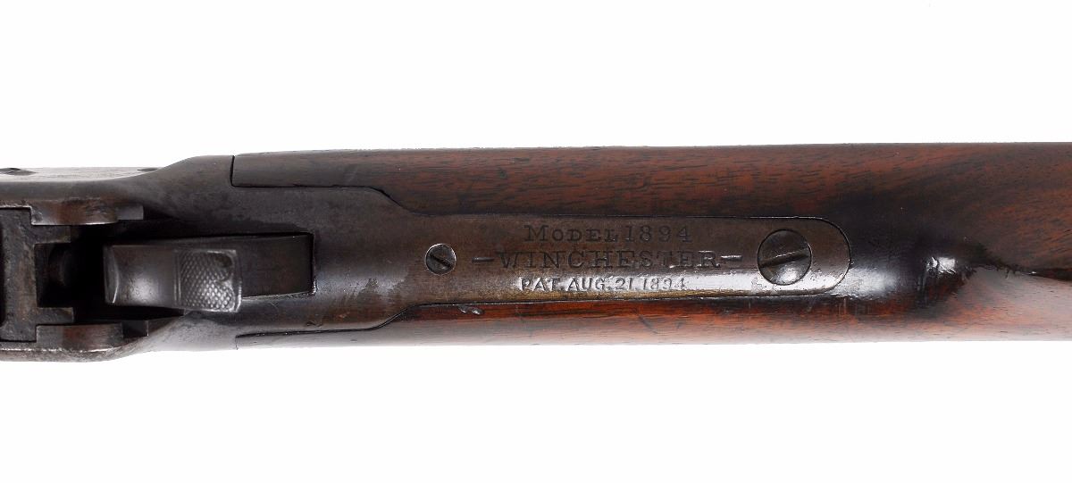 Antique Winchester Model 1894 rifle in .32-40, serial #109733, with a 26? octagon barrel with a fair, lightly pitted bore. This 1897–made rifle has an overall plum-brown patina on both the barrel and magazine tube, with slight silvering at the muzzle as well as along the edges of the barrel facets. The frame has a slightly lighter brown patina with spots of mild freckling, as well as a few spots of mottled gray along the top edge along the left side. There are some similar areas of gray mottling along the underside of the magazine tube. The rifle is equipped with an original German silver front sight blade and a non-original rear barrel sight that matches the condition of the rest of the metal closely. The uncheckered walnut forend and buttstock are in good-very good condition with minor handling marks and surface blemishes scattered along the added varnish finish. Additionally, there is an area of moderate bruising on the left side of the buttstock where a series of impacts occurred just above the line of the belly. The crescent-shaped buttplate has a dark brown overall patina with light-moderate freckling and mild surface oxidation throughout. The mechanism is tight and the action is fully functional. This is a good-near very good example of an antique Winchester Model 1894, and in one of the most desirable chamberings.
