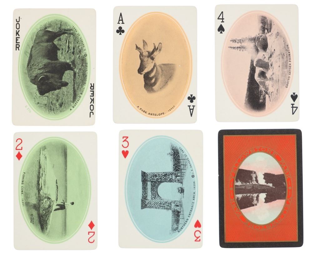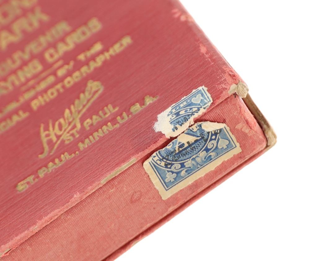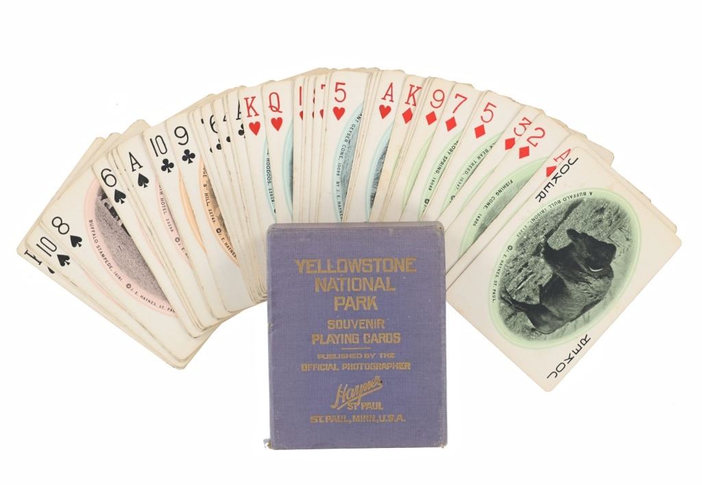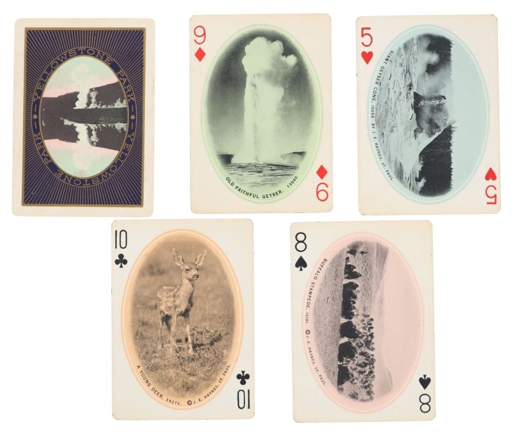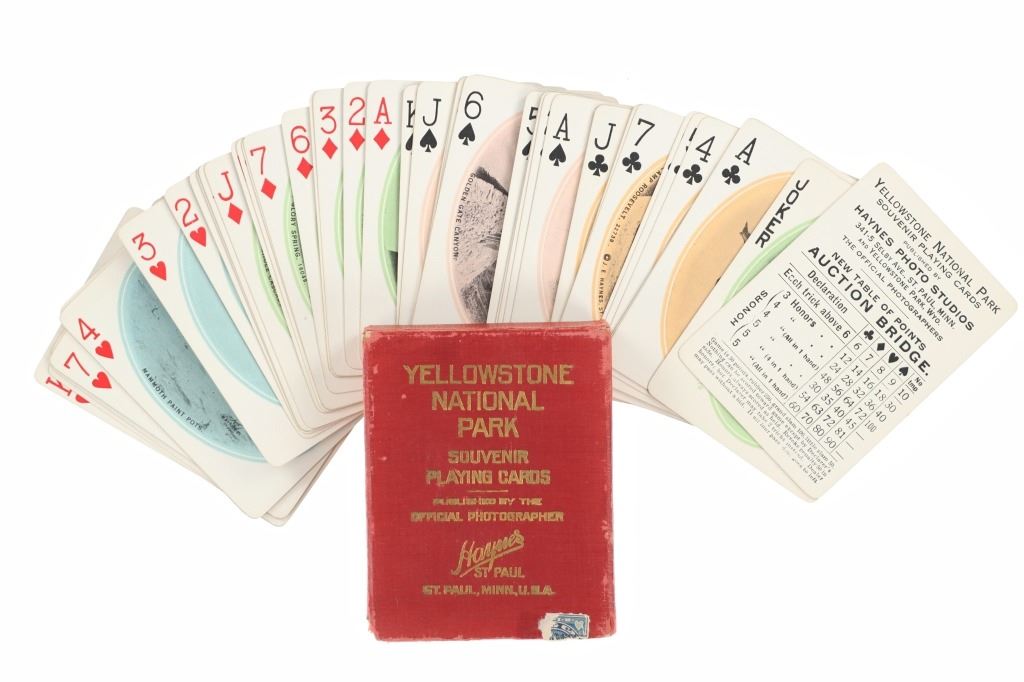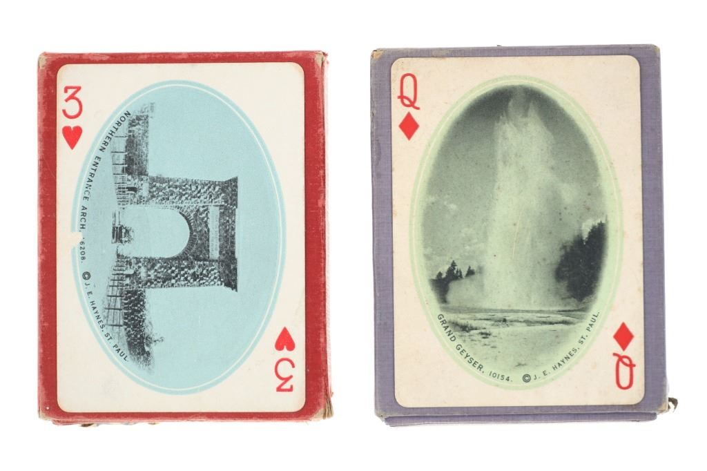 The lot features two sets of circa 1894-1910's Yellowstone National Park Haynes Photographer playing card sets. Both sets show a dark blue and gold Yellowstone Park Old Faithful image on the backside of the cards. The first set in the red box has gilt gold lettering and the original US gambling tax stamp attached, marked on the front, "YELLOWSTONE NATIONAL PARK SOUVENIR PLAYING CARDS PUBLISHED BY THE OFFICIAL PHOTOGRAPHER HAYNES ST. PAUL ST. PAUL, MINN., U.S.A." On the back the example card is the 3 of hears with the Northern Entrance Arch, 16208 J.E. Haynes, St. Paul image. This set also has the original Auction Bridge rules card. Each card has a different original Haynes Yellowstone image with a colorized tint including the image title, number and photographer mark, including the Buffalo Joke, titled, "A Buffalo Bull (Bison), 21202 J.E. Haynes, St. Paul". The next set, a purple edition has the same gilt lettering. This also has the same design with a different Haynes photo on each card with title, etc. Red deck has a total of 54 cards (52 number and face cards, 1 Joker and 1 rules card). Purple deck has a total of 53 cards (52 number and face cards and 1 Joker). Each case is 3 5/8-inches by 3-inches by 7/8-inches.