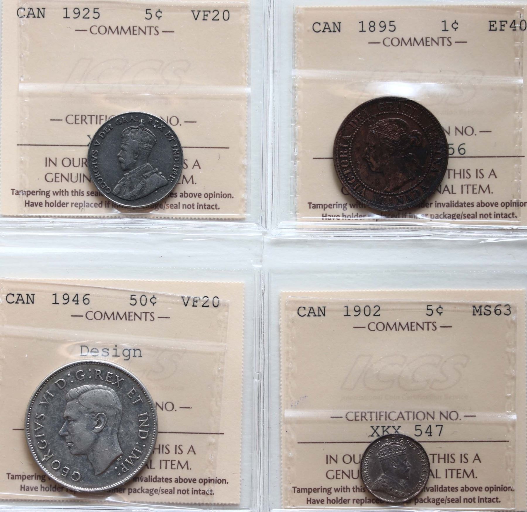1895 1¢ ICCS Extra Fine-40, 1925 5¢ ICCS Very Fine-20, 1902 5¢ ICCS Choice Mint State-63,1946 50¢ De