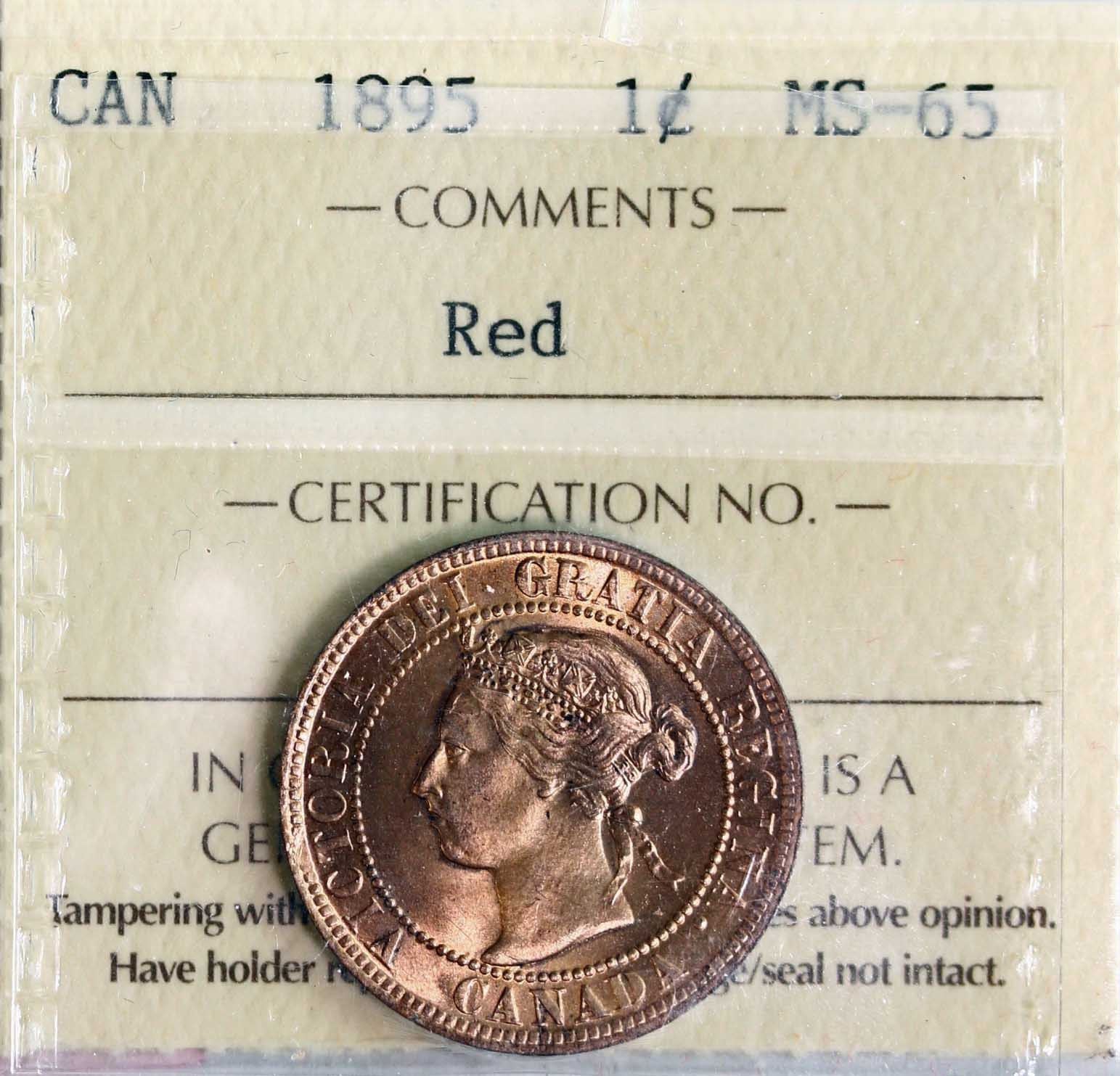 1895 1¢ ICCS Gem Mint State-65 Red, 90% Full Red. An attractive example.