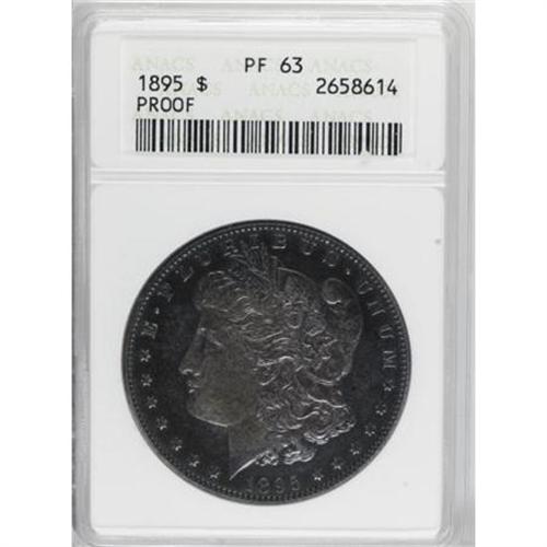 1895 $1 PR63 ANACS. This coin was created toward the end of a shining era in American history. The Civil War of the 1860s was a gloomy memory. The era of Reconstruction, 1865-1877, had been fraught with criminality as con artists known as Carpet Baggers sought to enrich themselves as the nation recovered from war, and the Indian Wars in the west caught the publics attention. The 1880s was called the Gilded Age by none other than Mark Twain himself. It was the decade of the robber barons, when the pursuit of wealth trumped the recent, gloomy, warring past. As coin collectors all know, silver mines in Nevada underscored this pursuit of wealth, for a vast fortune was regularly being taken from the earth and added to Treasury vaults via the Bland-Allison Act of 1878, which gave the value of one dollar to about 80 cents worth of silver. It supported western mining and was controversial in its day, yet the irony is that, over time, as fiat money (paper currency) suffered from the ravages of inflation, this very commodity became a precious asset, both for individuals and for the nation and its government. <BR> Any silver dollar of this date is a key date and highly desirable. Millions of collectors may seek to own one, but the truth is that few ever will. Its rarity is undeniable, but what of its place in time? The 1895 Morgan silver dollar is even more alluring once given its historical setting. Baseball Hall of Famer Babe Ruth was born in this year, and so was boxing champion Jack Dempsey. The first U.S. Open golf championship was held in 1895, and for the first time ever a professional football game was played in this same year-in Latrobe, Pennsylvania. Little more than a hundred years ago, sports in America were mostly amateur affairs. Nostalgia beckons to many collectors. It forms the essence of why they collect. The United States in 1895 had not yet become a major international nation. That distinction lay ahead. It came after a terrible war was fought, in Europe, by many boys and young men born in this year. America would never be able to recapture the innocence that lulled the land in 1895.<BR> This 1895 dollar is a symbol of that late 19th century era. It is deeply toned on each side and this depth of color does much to conceal the underlying hairlines that account for the PR63 grade. Other than the brightness from cleaning, there are no nicks or scratches that need to be mentioned. <BR><BR><b>Shipping:</b> Coins & Currency (<a target="_blank" href="http://www.heritageauctions.com/common/shipping.php">view shipping information</a>)
