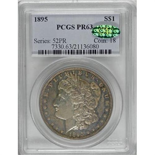 <B>1895 $1 PR63 PCGS. CAC.</B></I> The 1895 dollar is known as the "King of the Morgan Dollars" because it is the rarest and most sought-after date in the series. Ownership of this popular rarity is the true measure of completeness for a collection of Morgans--the 1895 proof is the only real "stopper" in the series.<BR> According to Mint records, there were 12,000 regular circulation dollars struck for 1895, along with 880 proof specimens. However, only proofs have been accounted for in the present day, leaving the question as to where the 12,000 business strikes went. Roger Burdette, in an article entitled "Philly 1895 Morgan Dollars" in the <I>Coin Values</B></I> supplement to <I>Coin World's</B></I> July 3, 2006 issue, writes: <BR><BR>"... during the past 110 years not one example has been conclusively identified. Every known 1895 Morgan silver dollar examined has turned out to be one of 880 proof pieces struck for collectors. What happened to these 12,000 coins? Were they hurriedly melted sometime during the last century? Did someone buy them all and store them in a vault in the Nevada desert? Did they actually exist or were they a bookkeeping convenience?"<BR><BR>We have no definitive answers to questions such as these, but they do serve to heighten the mystique of the 1895 Morgan dollar. What is for sure is that an 1895 proof is necessary for the completion of a Morgan silver dollar collection. And the lovely Select example presented in this lot will nicely fit the bill in this regard. Splashes of golden-brown, deep purple, and aqua-blue toning adorn both sides, and a powerful strike is manifested in sharp definition on the design elements, including complete separation in the strands of Liberty's hair and the feathers on the eagle. Well cared for surfaces are devoid of mentionable abrasions; it is only the presence of a few faint hairlines that blocks a higher grade. In any event, this is a marvelous example for the PR63 grade designation.<BR><BR><B>Coin Engraver:</B> George T. Morgan<BR><BR><b>Shipping:</b> Coins & Currency (<a target="_blank" href="http://www.heritageauctions.com/common/shipping.php">view shipping information</a>)