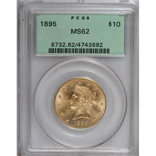<B>1895 $10 MS62 PCGS.</B></I> PCGS Population (1654/365). NGC Census: (3065/1448). Mintage: 567,700. Numismedia Wsl. Price for NGC/PCGS coin in MS62: $395. (#8732)<BR><BR><B>Coin Engraver:</B> Christian Gobrecht<BR><BR><b>Shipping:</b> Coins & Currency (<a target="_blank" href="http://www.heritageauctions.com/common/shipping.php">view shipping information</a>)
