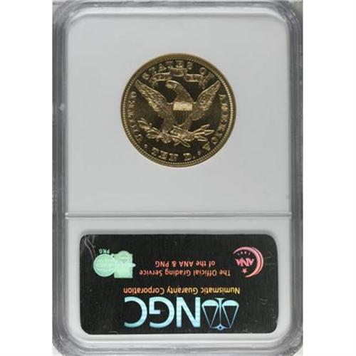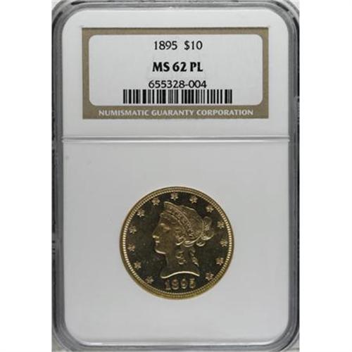 <B>1895 $10 MS62 Prooflike NGC.</B></I> Gorgeous yellow-gold color complements sharply struck design elements on this bright ten dollar piece, and pronounced field-motif contrast is evident when the coin is rotated under a light source. A scattering of tiny marks and luster grazes preclude a higher grade, nevertheless, this MS62 example exudes considerable eye appeal. Census: 6 in 62 Prooflike, 0 finer (7/07).<BR><BR><B>Coin Engraver:</B> Christian Gobrecht<BR><BR><b>Shipping:</b> Coins & Currency (<a target="_blank" href="http://www.heritageauctions.com/common/shipping.php">view shipping information</a>)