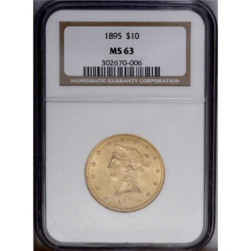 <B>1895 $10 MS63 NGC.</B></I> A frosty Mint State example with hints of pink over brilliant yellow-gold surfaces. Although not rare in this grade, it is a true condition rarity in higher grades. Census: 1144 in 63, 132 finer (1/06).