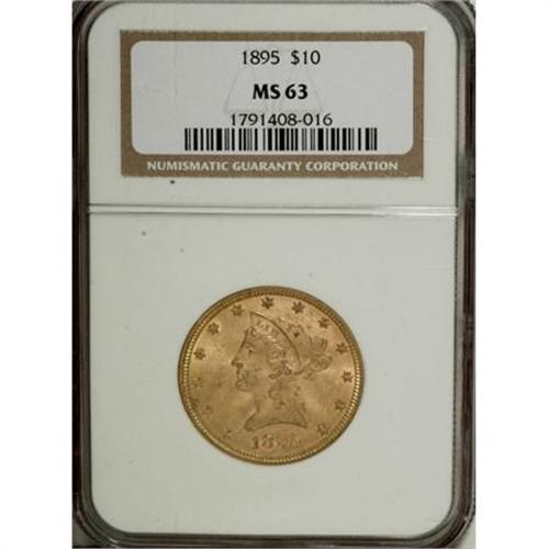 <B>1895 $10 MS63 NGC.</B></I> NGC Census: (1365/154). PCGS Population (333/40). Mintage: 567,700. Numismedia Wsl. Price for NGC/PCGS coin in MS63: $1,190. (#8732)<BR><BR><B>Coin Engraver:</B> Christian Gobrecht<BR><BR><b>Shipping:</b> Coins & Currency (<a target="_blank" href="http://www.heritageauctions.com/common/shipping.php">view shipping information</a>)