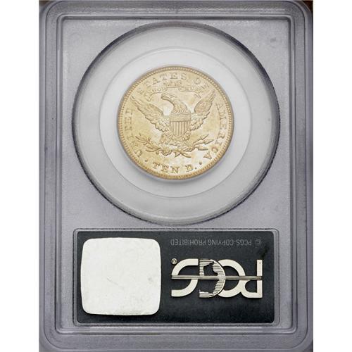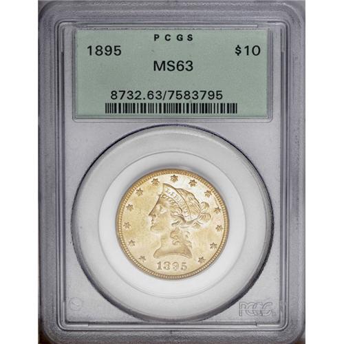 <B>1895<$10> MS63 PCGS.</B></I> This peach-gold type coin delivers potent luster, and although small marks are distributed, none merit individual description. Encased in a green label holder. <BR><BR><B>Important notice:</B> Heritage usually auctions material at the rate of 200-250 lots per hour. On some occasions eBay Live bid software or the Internet may not be able to keep up with the pace of the auction. We recommend placing a realistic absentee bid now as insurance to avoid disappointment. Occasionally the auctioneer may eliminate or reject an eBay Live bid, and the auctioneer may also reopen a lot after the close of the eBay live bidding (usually because we missed an audience bid), and may reject your bid even if it shows you as the winning bidder. By bidding via eBay Live, you agree that Heritage may award the lot to another bidder at its sole discretion under the circumstances described above or any other reasonable circumstances. Since eBay bids are not shown to us until we open the lot on the floor, we treat those bids just like floor bids. In most cases the floor responds before the eBay bid is presented to us, due to Internet lag time, so for consistency we have made it a policy that floor bids are always considered first over tie eBay live bids. Also please note that all Heritage lots purchased through eBay Live carry a 20% Buyer's Premium. Please make sure you read the Terms and Conditions before you bid. This lot is being auctioned in conjunction with a live floor auction by Heritage Galleries & Auctioneers. All final auction and invoice information will be supplied by Heritage Galleries & Auctioneers, and all other information should be considered preliminary. Lot:4051 <BR><BR><B>Winning Notification and Billing:</B> After the FINAL session in this auction is complete, Heritage will send e-mail and snail mail invoices. This process normally takes several days. All final auction and invoice information will be supplied by Heritage Galleries & Auctioneers, and all other information should be considered preliminary. <BR><BR>This auction will be conducted on a live auction floor and over the Internet through eBay Live. If you choose to place an absentee bid, please take a moment to <font color='#0000ff'><u><a href='http://pages.ebay.com/liveauctions/help/before/laabsentee.html'>learn how eBay Live absentee bidding works</a></u></font><font color='#000000'>