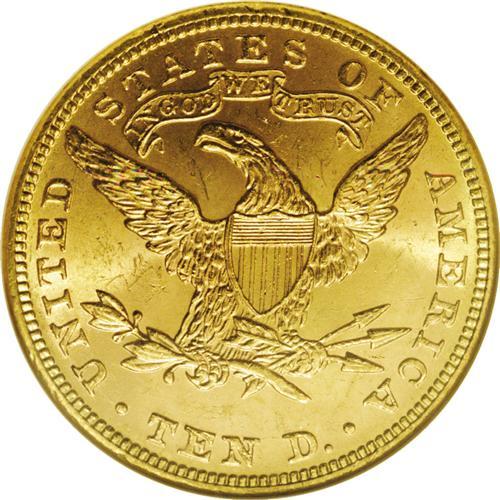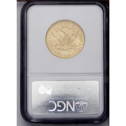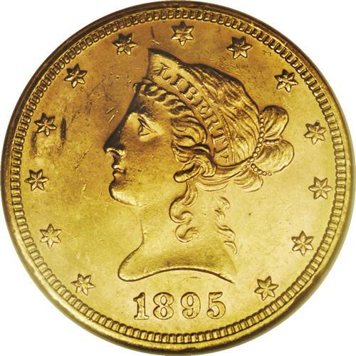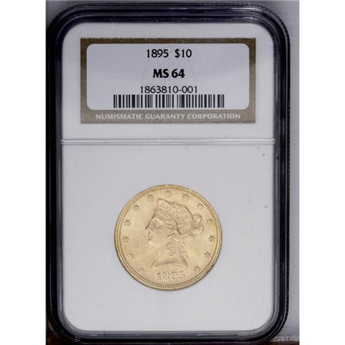 <B>1895 $10 MS64 NGC.</B></I> The 1895 Ten Dollar combines a limited mintage of nearly 568,000 pieces and undeniable scarcity above the Select BU level. This specimen exhibits sharply struck design features, though the hair curls at the temple and forehead reveal minor softness. Satiny luster exudes from relatively smooth, apricot-gold surfaces that show just a few minor luster grazes. An attractive Near Gem; only five coins have been graded higher by NGC and PCGS combined (12/05).