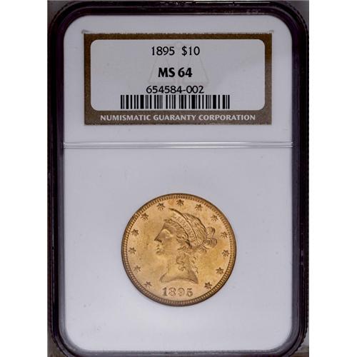 <B>1895<$10> MS64 NGC.</B></I> The base of the 95 in the date is repunched. A lustrous and meticulously struck orange-gold near-Gem. Attractively preserved despite a light vertical mark on the left obverse field. Since NGC and PCGS combined have certified a mere five pieces finer, MS64 is the highest generally attainable grade.