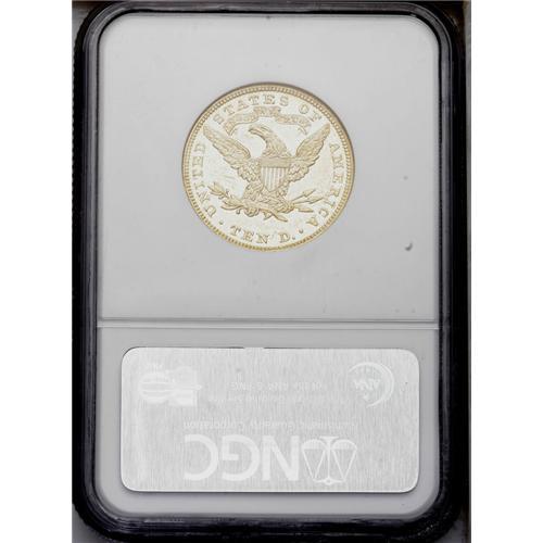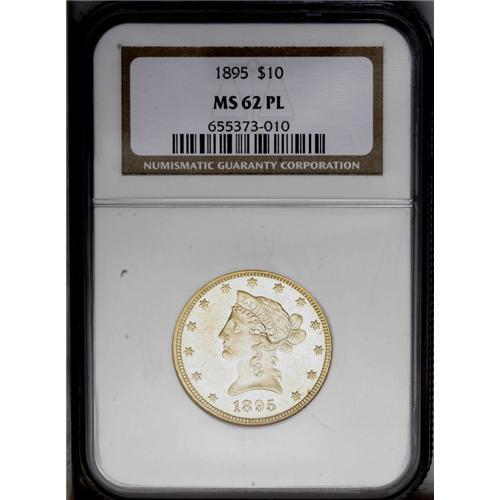 <B>1895<$10> Prooflike MS62 NGC.</B></I> This sharply struck eagle is typically abraded, but the flashy fields provide substantial eye appeal. An available date overall, but scarce as Prooflike. Census: 5 in 62 Prooflike, 0 finer (3/06). <BR><BR><B>Important notice:</B> Heritage usually auctions material at the rate of 200-250 lots per hour. On some occasions eBay Live bid software or the Internet may not be able to keep up with the pace of the auction. We recommend placing a realistic absentee bid now as insurance to avoid disappointment. Occasionally the auctioneer may eliminate or reject an eBay Live bid, and the auctioneer may also reopen a lot after the close of the eBay live bidding (usually because we missed an audience bid), and may reject your bid even if it shows you as the winning bidder. By bidding via eBay Live, you agree that Heritage may award the lot to another bidder at its sole discretion under the circumstances described above or any other reasonable circumstances. Since eBay bids are not shown to us until we open the lot on the floor, we treat those bids just like floor bids. In most cases the floor responds before the eBay bid is presented to us, due to Internet lag time, so for consistency we have made it a policy that floor bids are always considered first over tie eBay live bids. Also please note that all Heritage lots purchased through eBay Live carry a 20% Buyer's Premium. Please make sure you read the Terms and Conditions before you bid. This lot is being auctioned in conjunction with a live floor auction by Heritage Galleries & Auctioneers. All final auction and invoice information will be supplied by Heritage Galleries & Auctioneers, and all other information should be considered preliminary. Lot:4053 <BR><BR><B>Winning Notification and Billing:</B> After the FINAL session in this auction is complete, Heritage will send e-mail and snail mail invoices. This process normally takes several days. All final auction and invoice information will be supplied by Heritage Galleries & Auctioneers, and all other information should be considered preliminary. <BR><BR>This auction will be conducted on a live auction floor and over the Internet through eBay Live. If you choose to place an absentee bid, please take a moment to <font color='#0000ff'><u><a href='http://pages.ebay.com/liveauctions/help/before/laabsentee.html'>learn how eBay Live absentee bidding works</a></u></font><font color='#000000'>