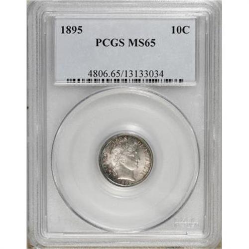 <B>1895 10C MS65 PCGS.</B></I> This intricately struck Gem has a lustrous obverse with a brilliant center and a blush of emerald-green along the left border. The reverse is satiny and has dusky lavender and steel-blue toning. Unabraded, low mintage, and desirable. Population: 12 in 65, 9 finer (10/07).<BR><BR><B>Coin Engraver:</B> Charles E. Barber<BR><BR><b>Shipping:</b> Coins & Currency (<a target="_blank" href="http://www.heritageauctions.com/common/shipping.php">view shipping information</a>)