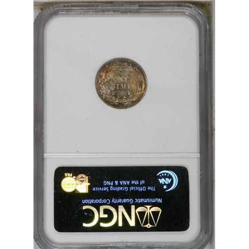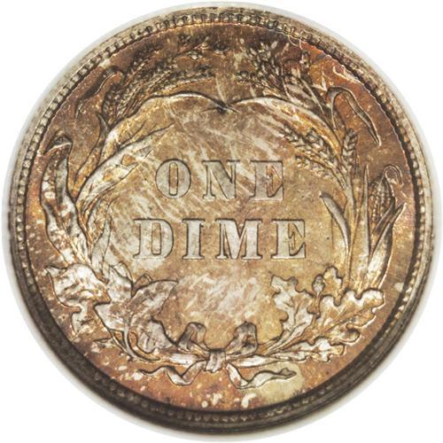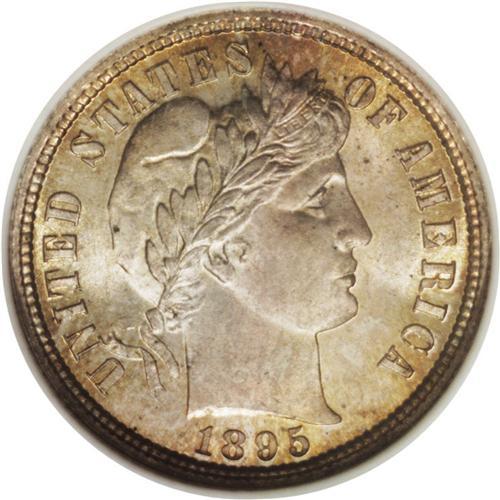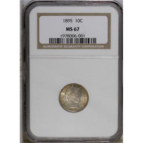 <B>1895<10C> MS67 NGC.</B></I> Lemon shades invigorate the obverse margin, while the portrait and obverse field are cream-gray. The reverse features dappled honey-gold and pearl-gray centers, with champagne patina across the periphery. An intricately struck Superb Gem of this rare issue. Where minute detail is absent, such as on the top of the cap and the portion of the hair ribbon left of the knot, the loss is due to mint lapping of the die, rather than any deficiency in strike. As one would expect from the lofty third party grade, cartwheel luster is dazzling, and it blasts through the attractive and moderate toning. Those in search of marks will be surprised to find that the reverse is pristine, as if the piece had been lifted from the dies by a gloved hand immediately after the strike. The obverse field is also immaculate, and even the portrait, which normally accumulates handling marks from even casual contact, is remarkably smooth.<BR> Such immense quality would be important on a "common" Philadelphia issue, of which there are many in the Barber dime series. However, the 1895 is instead one of the most difficult dates in the series. Mintages at Philadelphia for the type began generously in 1892, with more than 12 million pieces struck. An economic panic (such events are now called "recessions") affected the mintage of subsequent issues. The 1893 had a lesser emission of 3.3 million pieces. For the 1894, mintages declined further to 1.33 million coins. Finally, Philadelphia production bottomed out at 690,000 pieces in 1895. This proved to be the lowest mintage of any P-mint date, most of which had productions above 10 million pieces. Difficult as the 1895 is, the issue has long been in the shadow of the 1895-O, the lowest mintage of the type at any Mint aside from the legendary and virtually non-collectible 1894-S. The 1895 is less rare than the 1895-O, probably because there were more collectors on the East Coast than in the South. But the 1895 emerges as a formidable rarity at the MS67 level, where it becomes a significant player within a competitive Registry holding. Census: 2 in 67, 1 finer (9/06).