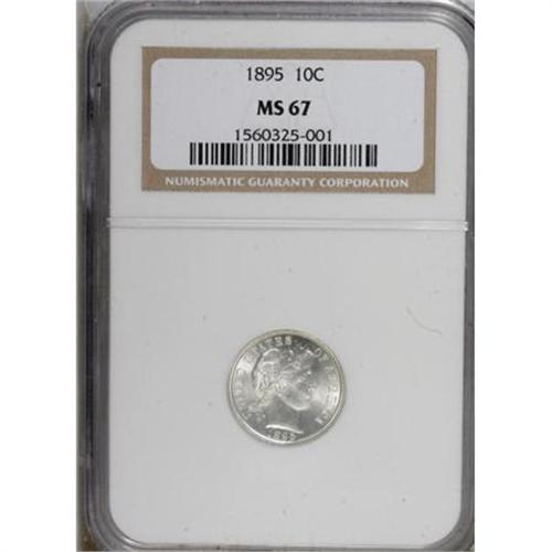 <B>1895 10C MS67 NGC.</B></I> Contemporary disdain for the Barber design is well-documented in numismatic literature, and unsurprisingly, few examples of any denomination were saved in Mint State. Not only was the present piece preserved, however, but it was kept in virtually unimprovable condition. The utterly brilliant, snow-white surfaces of this Superb Gem dime display amazingly bright, coruscating luster. With a combination of exemplary visual appeal and the challenges posed by the semi-key issue (mintage of 690,000 pieces), this crisply struck example rates as one of the most desirable pieces a date collector could acquire. NGC and PCGS have certified just four Superb Gems between them, with only one of the NGC examples graded above MS67 (9/07).<BR><BR><B>Coin Engraver:</B> Charles E. Barber<BR><BR><b>Shipping:</b> Coins & Currency (<a target="_blank" href="http://www.heritageauctions.com/common/shipping.php">view shipping information</a>)