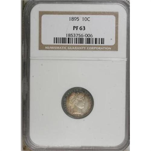 <B>1895 10C PR63 NGC.</B></I> NGC Census: (26/214). PCGS Population (46/165). Mintage: 880. Numismedia Wsl. Price for NGC/PCGS coin in PR63: $420. (#4879)<BR><BR><B>Coin Engraver:</B> Charles E. Barber<BR><BR><b>Shipping:</b> Coins & Currency (<a target="_blank" href="http://www.heritageauctions.com/common/shipping.php">view shipping information</a>)