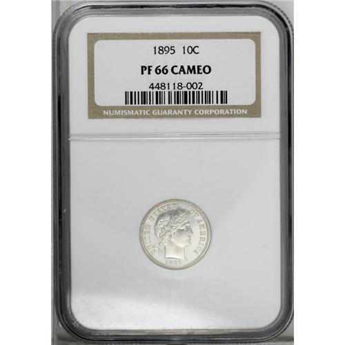 <B>1895<10C> PR66 Cameo NGC.</B></I> A brilliant and gorgeous specimen with frosty devices and glassy fields. A pinpoint-sharp Premium Gem; one of just 880 pieces struck. Census: 12 in 66 Cameo, 15 finer (3/06).