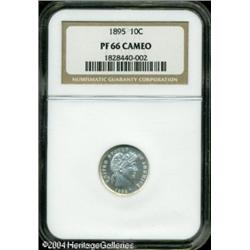 1895 10C PR66 Cameo NGC. A needle-sharp premium Ge <B>1895 10C PR66 Cameo NGC.</B></I> A needle-sharp premium Gem with irrefutable contrast between the frosty devices and the darkly reflective fields. Pristine aside from a light handling mark on the back of the neck. Population: 8 in 66 Cameo, 7 finer (11/04). <BR><BR><B>Important notice:</B> Heritage usually auctions material at the rate of 200-250 lots per hour. On some occasions eBay Live bid software or the Internet may not be able to keep up with the pace of the auction. We recommend placing a realistic absentee bid now as insurance to avoid disappointment. Occasionally the auctioneer may eliminate or reject an eBay Live bid, and the auctioneer may also reopen a lot after the close of the eBay live bidding (usually because we missed an audience bid), and may reject your bid even if it shows you as the winning bidder. By bidding via eBay Live, you agree that Heritage may award the lot to another bidder at its sole discretion under the circumstances described above or any other reasonable circumstances. Since eBay bids are not shown to us until we open the lot on the floor, we treat those bids just like floor bids. In most cases the floor responds before the eBay bid is presented to us, due to Internet lag time, so for consistency we have made it a policy that floor bids are always considered first over tie eBay live bids. Also please note that all Heritage lots purchased through eBay Live carry a 20% Buyer's Premium. Please make sure you read the Terms and Conditions before you bid. This lot is being auctioned in conjunction with a live floor auction by Heritage Galleries & Auctioneers. All final auction and invoice information will be supplied by Heritage Galleries & Auctioneers, and all other information should be considered preliminary. Lot:5786