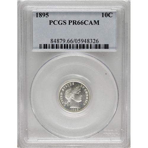 <B>1895 10C PR66 Cameo PCGS.</B></I> The profoundly mirrored fields are brilliant, and the strike is needle-sharp. Cameo contrast is particularly evident on the reverse. A low mintage date. Population: 8 in 66 Cameo, 5 finer (2/07).<BR><BR><b>Shipping:</b> Coins & Currency (<a target="_blank" href="http://www.heritageauctions.com/common/shipping.php">view shipping information</a>)