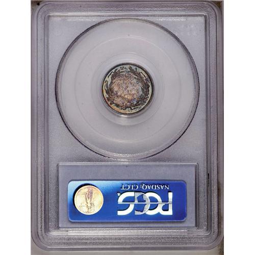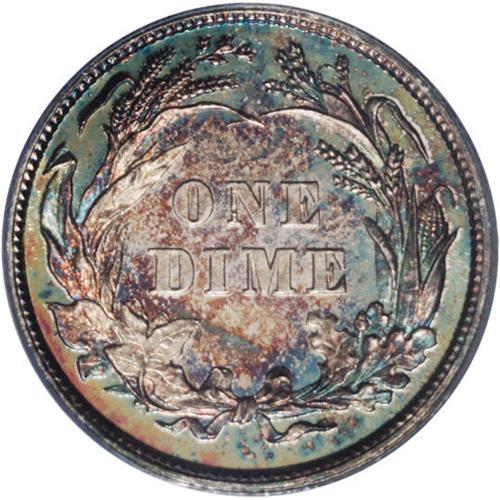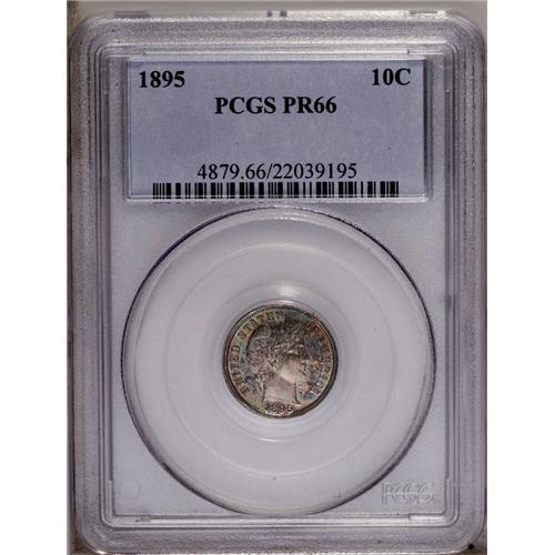 <B>1895<10C> PR66 PCGS.</B></I> The 1895 dime has always been recognized as an important coin in the Barber series because of its low mintage of only 690,000 pieces. This scarcity of business strikes gives the proofs of this year added value. This is a flashy, deeply reflective proof striking that displays variegated turquoise and rose toning over each side. A couple of marks on Liberty's cheekbone are well concealed by the toning and do not affect the overall appearance or desirability of this high grade coin.