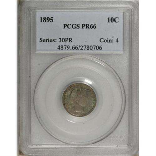 <B>1895 10C PR66 PCGS.</B></I> A melange of cobalt-blue, magenta, gray, and yellow-gold rest over the undisturbed surfaces. The motifs are sharply struck, and the preservation is exceptional. A scant 880 proofs were struck. Population: 31 in 66, 15 finer (5/07).<BR><BR><b>Shipping:</b> Coins & Currency (<a target="_blank" href="http://www.heritageauctions.com/common/shipping.php">view shipping information</a>)