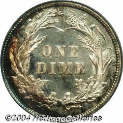 <B>1895<10C> PR67 PCGS.</B></I> The year 1895 is magical for Proof coins on the influence of the proof-only 1895 silver dollar. In the case of this Barber dime issue, it is also a scarce, low-mintage issue in business strike format with only 690,000 such coins minted, and most well-circulated. Just 880 Proofs were coined, with most survivors in lower Proof quality. This Superb Gem Proof has excellent cameo contrast although it is not designated as a Cameo Proof. The centers on each side are mostly brilliant with gorgeous rose, lilac, and blue around the entire circumference on the obverse, and in a crescent around part of the reverse. This is one of the finest surviving Proofs and is tied for finest certified by PCGS. Population: 15 in 67, 0 finer (9/04). <BR><BR><B>Important notice:</B> Heritage usually auctions material at the rate of 200-250 lots per hour. On some occasions eBay Live bid software or the Internet may not be able to keep up with the pace of the auction. We recommend placing a realistic absentee bid now as insurance to avoid disappointment. Occasionally the auctioneer may eliminate or reject an eBay Live bid, and the auctioneer may also reopen a lot after the close of the eBay live bidding (usually because we missed an audience bid), and may reject your bid even if it shows you as the winning bidder. By bidding via eBay Live, you agree that Heritage may award the lot to another bidder at its sole discretion under the circumstances described above or any other reasonable circumstances. Since eBay bids are not shown to us until we open the lot on the floor, we treat those bids just like floor bids. In most cases the floor responds before the eBay bid is presented to us, due to Internet lag time, so for consistency we have made it a policy that floor bids are always considered first over tie eBay live bids. Also please note that all Heritage lots purchased through eBay Live carry a 20% Buyer's Premium. Please make sure you read the Terms and Conditions before you bid.