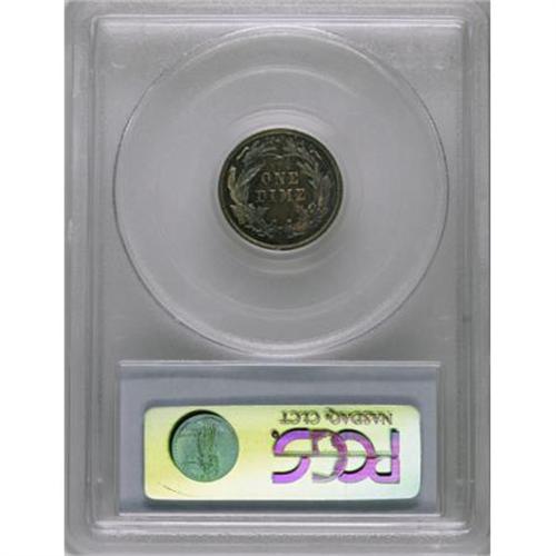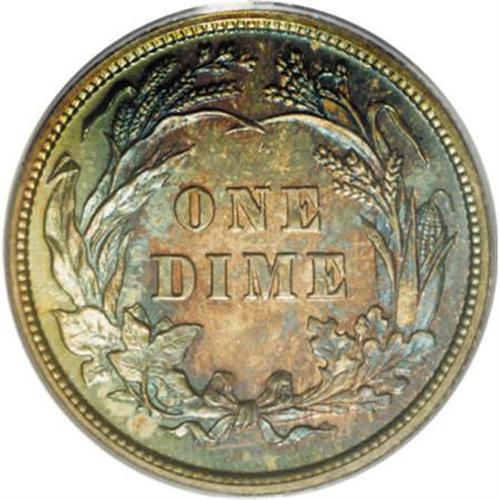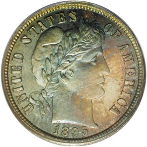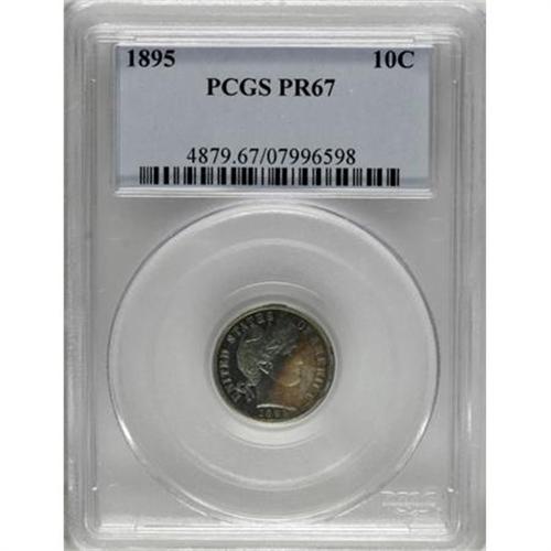 <B>1895 10C PR67 PCGS.</B></I> A boldly struck and wonderfully well-preserved specimen from an issue of just 880 pieces. Each side displays areas of thin blue-green patina and zones of thicker peach-tan toning. While other pieces may have identical numerical grades, it is difficult to imagine an example with better visual appeal. Population: 15 in 67, 0 finer (7/07).<BR><BR><B>Coin Engraver:</B> Charles E. Barber<BR><BR><b>Shipping:</b> Coins & Currency (<a target="_blank" href="http://www.heritageauctions.com/common/shipping.php">view shipping information</a>\)