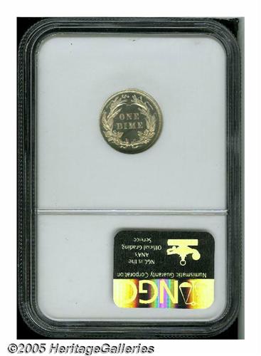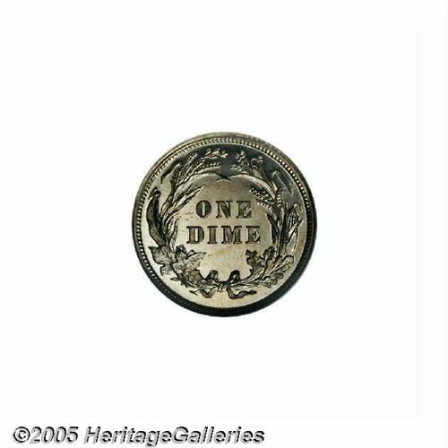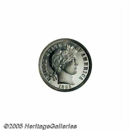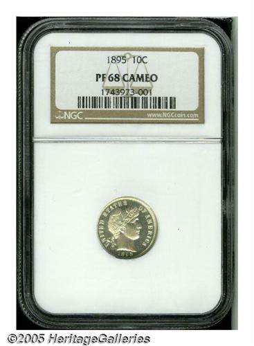 <B>1895<10C> PR68 Cameo NGC.</B></I> Sometimes overlooked by collectors, the 1895 proof dime is a key issue in the series. This is not because of the low mintage of proofs (880 pieces), but because of the scarcity and low mintage of business strikes with only 690,000 pieces produced. As a result, there is additional date pressure on high grade 1895 proofs. This is a spectacular cameoed example that is brilliant throughout with surfaces that approach technical perfection. Close examination shows that the dies were heavily polished with subsequent thinning of the ribbon below Liberty's hair on the obverse. The heavy die polish also resulted in deeply reflective fields which set up a "black" background against the dazzling white mint frost on the devices.
