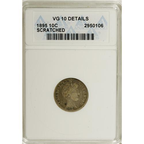 <B>1895 10C --Scratched--ANACS. VG10 Details.</B></I> NGC Census: (1/106). PCGS Population (2/109). Mintage: 690,000. Numismedia Wsl. Price: $193. (#4806)<BR><BR><b>Shipping:</b> Coins & Currency (<a target="_blank" href="http://www.heritageauctions.com/common/shipping.php">view shipping information</a>)