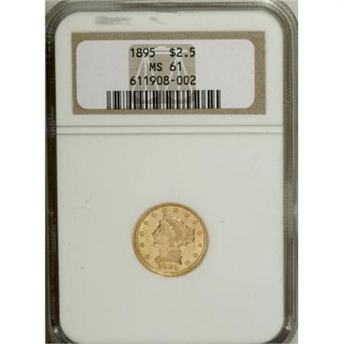 <B>1895 $2 1/2 MS61 NGC.</B></I> NGC Census: (26/154). PCGS Population (22/131). Mintage: 6,000. Numismedia Wsl. Price for NGC/PCGS coin in MS61: $417. (#7847)<BR><BR><B>Coin Engraver:</B> Christian Gobrecht<BR><BR><b>Shipping:</b> Coins & Currency (<a target="_blank" href="http://www.heritageauctions.com/common/shipping.php">view shipping information</a>\)