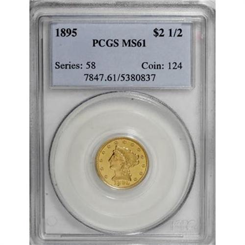 <B>1895 $2 1/2 MS61 PCGS.</B></I> PCGS Population (22/131). NGC Census: (26/154). Mintage: 6,000. Numismedia Wsl. Price for NGC/PCGS coin in MS61: $417. (#7847)<BR><BR><B>Coin Engraver:</B> Christian Gobrecht<BR><BR><b>Shipping:</b> Coins & Currency (<a target="_blank" href="http://www.heritageauctions.com/common/shipping.php">view shipping information</a>)