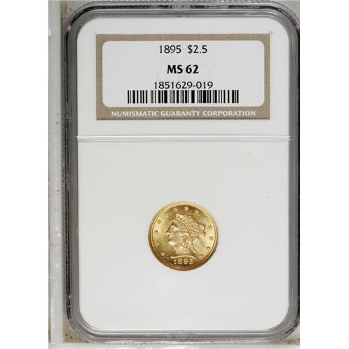<B>1895<$2 1/2> MS62 NGC.</B></I> A well struck and attractive orange-gold example with a few too many light abrasions, ticks, and scrapes to qualify for a higher grade.