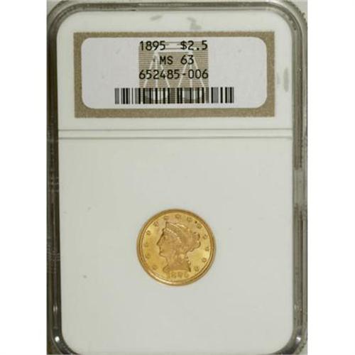 <B>1895 $2 1/2 MS63 NGC.</B></I> NGC Census: (36/59). PCGS Population (51/42). Mintage: 6,000. Numismedia Wsl. Price for NGC/PCGS coin in MS63: $730. (#7847)<BR><BR><B>Coin Engraver:</B> Christian Gobrecht<BR><BR><b>Shipping:</b> Coins & Currency (<a target="_blank" href="http://www.heritageauctions.com/common/shipping.php">view shipping information</a>\)