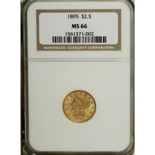<B>1895 $2 1/2 MS66 NGC.</B></I> With a business strike mintage of just 6,000 coins, this date is scarce in all grades, and examples at the Premium Gem level are seldom encountered. This is an underrated date that trades for little premium over the price of common dates, and it is an excellent candidate for type collectors who appreciate good value. A sharp strike and satin luster are accented by attractive yellow-gold with a hint of orange color.<BR><BR><b>Shipping:</b> Coins & Currency (<a target="_blank" href="http://www.heritageauctions.com/common/shipping.php">view shipping information</a>)
