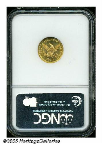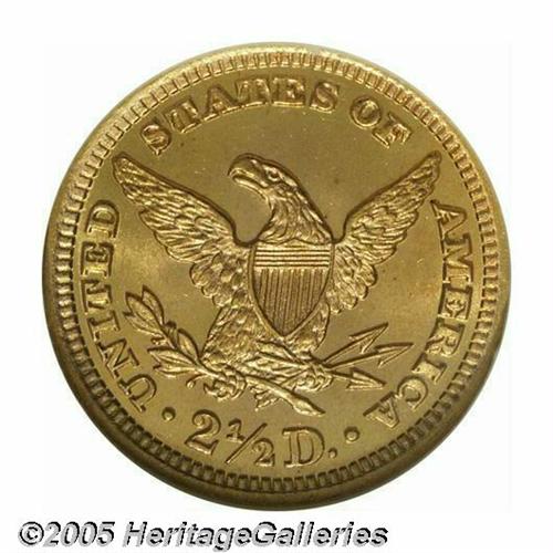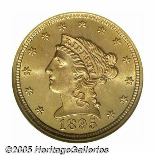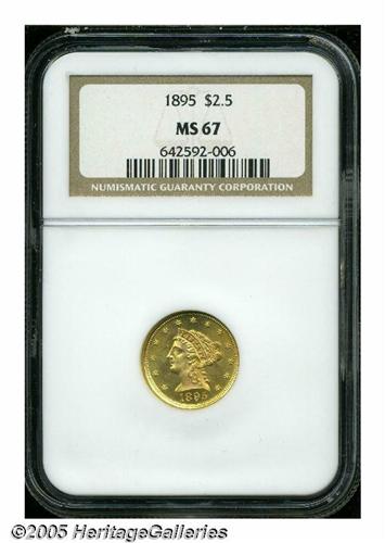 <B>1895<$2 1/2> MS67 NGC.</B></I> Here is one of the very finest of this date to exist. The surfaces are alive with radiant mint luster and the strike is quite sharp right at the very center of the coin. A scarce issue with just 6,000 coined for circulation. The combined NGC and PCGS population reports show a total of two coins graded this high, with none seen finer.
