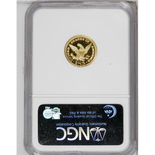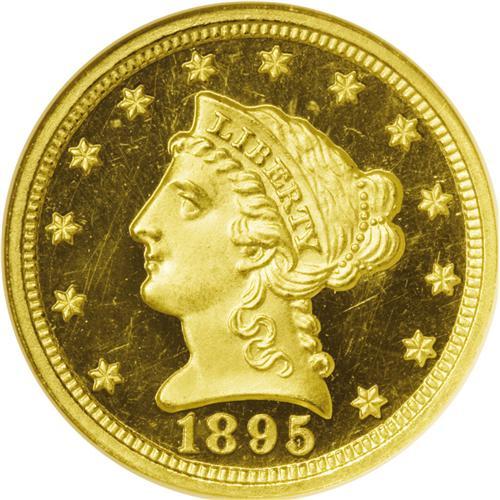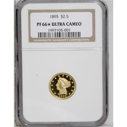 <B>1895<$2 1/2> PR66 <img border='0' src='http://www.heritagecoins.com/images/star.gif' width=10 height=10> Ultra Cameo NGC.</B></I> B-1. Awarded NGC's coveted and seldom-seen Star designation for superior eye appeal compared with other specimens of the same grade, this delectable coin shows deep, contrasting black-on-gold surfaces and highly frosted devices. A well struck and essentially contact-free example, from a scant original proof mintage of 119 specimens. A "minute point down from lower part of bun," as Breen describes in his proof <I>Encyclopedia,</B></I> is diagnostic for the B-1 proof die. The NGC <I>Census Report</B></I> shows only five coins finer, including only a single finer piece with the Star designation (7/06).