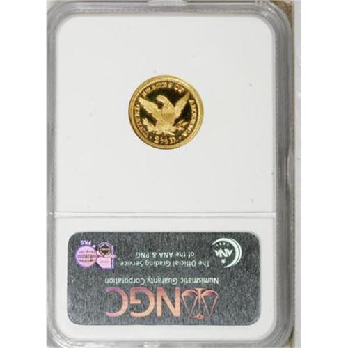 <B>1895 $2 1/2 PR68 <img src="/images/star.gif" width="10" height="10" alt="" border="0"> Ultra Cameo NGC.</B></I> The present specimen is the only 1895 quarter eagle to achieve the grade of PR68 at either NGC or PCGS. None have been certified finer. In fact, no proof 1895 half eagles, eagles, or double eagles have reached the grade of PR68 at either major service, which makes the current lot the single highest graded proof 1895 U.S. gold coin. As one would expect from its status of single finest certified, the eye appeal is remarkable. The yellow-gold devices are luminous, and provide profound contrast with the glassy fields.<BR> Only the most trivial surface imperfections exist, none of which are remotely worthy of discussion. For the purpose of pedigree tracing, we note a hair-thin line just to the right of the eagle's branch stem. A tiny die lump on the cheek is of mint origin, and is a diagnostic to distinguish the 119 proofs from the 6,000 business strikes that constitute the 1895 production. Although even the earliest business strikes, which could have prooflike fields, could never possess the dramatic device to field contrast of the present piece.<BR> The most famous proof rarity of 1895 is the silver dollar, since it is the sole proof-only issue of the Morgan series. But the proof mintage of the quarter eagle is less than one-fourth the emission of the 1895 dollar. At the PR68 level, the silver dollar is much more available, since 15 have been certified as PR68 (including Cameo, Deep Cameo, and Ultra Cameo examples) with one finer as PR69 Ultra Cameo. Although some would argue the comparison is akin to apples and oranges, it is made to show that the proof 1895 quarter eagle is significantly rarer than its legendary silver dollar counterpart. Those in need of the finest of the finest must consider the present opportunity.<BR><BR><b>Shipping:</b> Coins & Currency (<a target="_blank" href="http://www.heritageauctions.com/common/shipping.php">view shipping information</a>)
