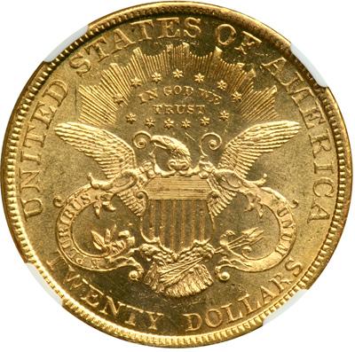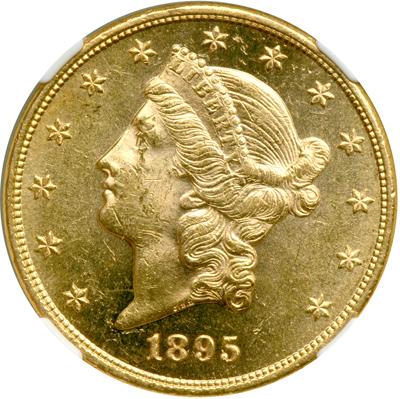 1895 $20 Liberty. NGC graded MS-62. Star. Semi-reflective surfaces, which is most unusual for 1895-P which tends to be frosty. Possibly an early strike from new dies. Pop 5; 8 finer in Star (PCGS # 9027) .
