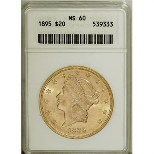 <B>1895 $20 MS60 ANACS.</B></I> NGC Census: (667/14054). PCGS Population (792/8904). Mintage: 1,114,656. Numismedia Wsl. Price for NGC/PCGS coin in MS60: $680. (#9027)<BR><BR><B>Coin Engraver:</B> James B. Longacre<BR><BR><b>Shipping:</b> Coins & Currency (<a target="_blank" href="http://www.heritageauctions.com/common/shipping.php">view shipping information</a>)